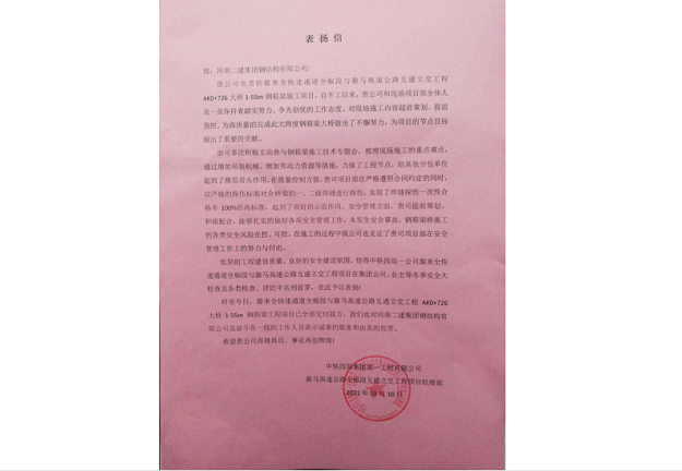 中铁四局集团第一工程有限公司向开云官方端网站登录入口发来表扬信